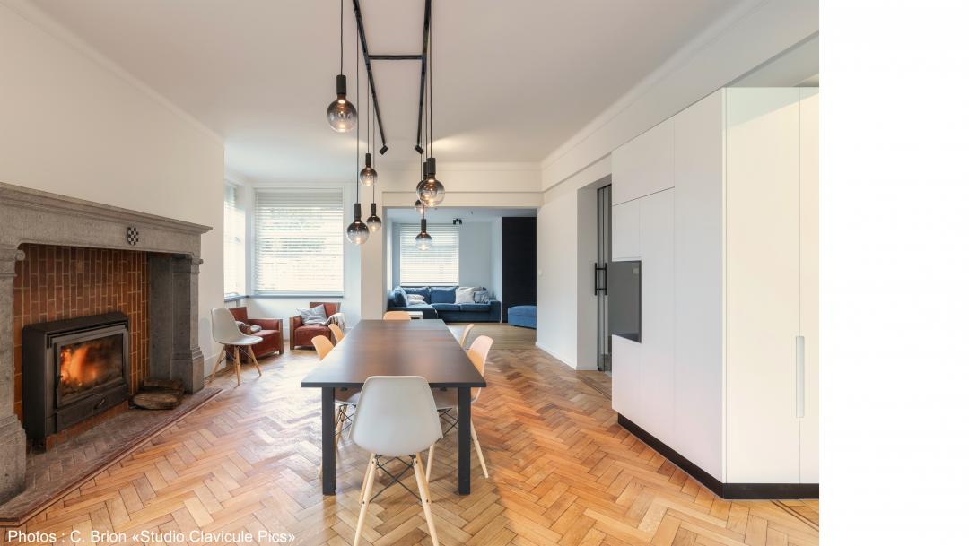 Le projet consiste en la transformation du rez-de-chaussée d'une habitation bourgeoise.L'intervention crée un espace ouvert fonctionnel, organisé autour d'un mobilier sur mesure animant la cage d'escalier existante et intégrant les mobiliers de cuisine et de nombreux rangements.