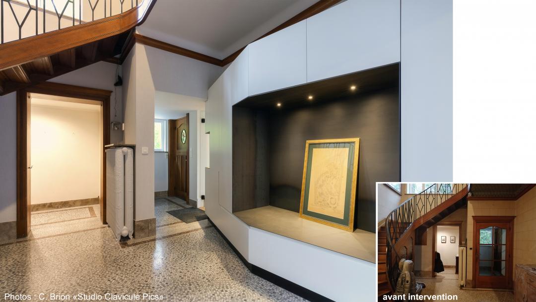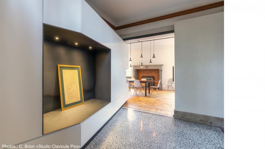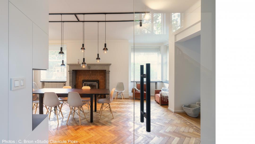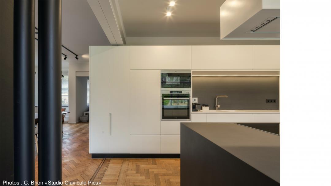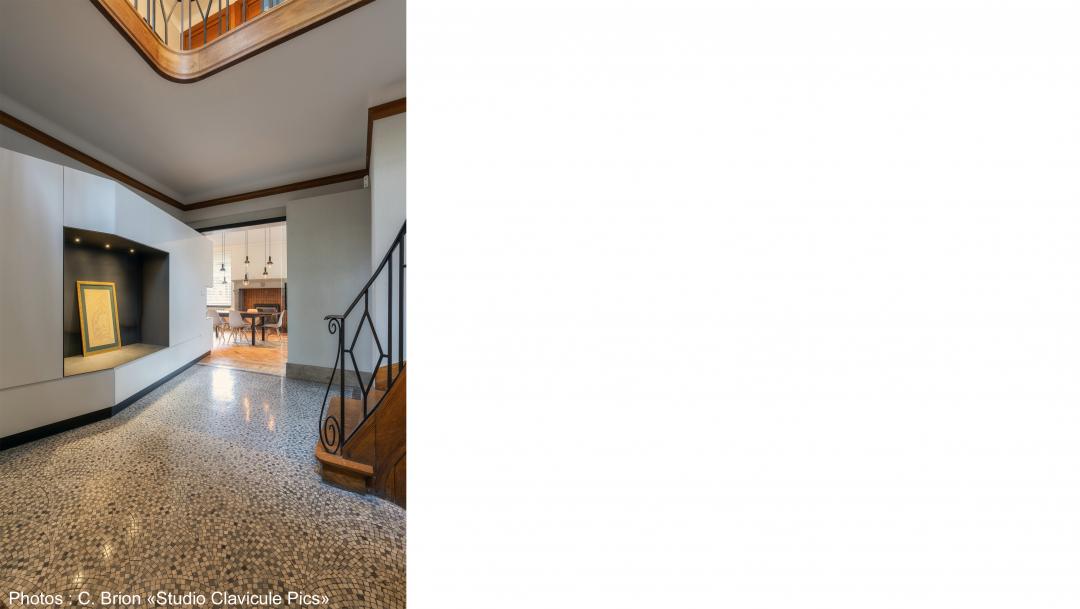 Le projet consiste en la transformation du rez-de-chaussée d'une habitation bourgeoise.L'intervention crée un espace ouvert fonctionnel, organisé autour d'un mobilier sur mesure animant la cage d'escalier existante et intégrant les mobiliers de cuisine et de nombreux rangements.