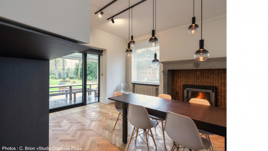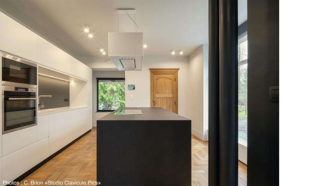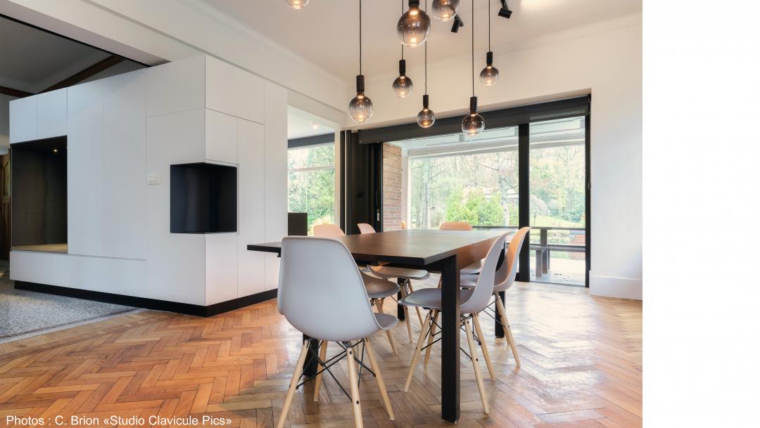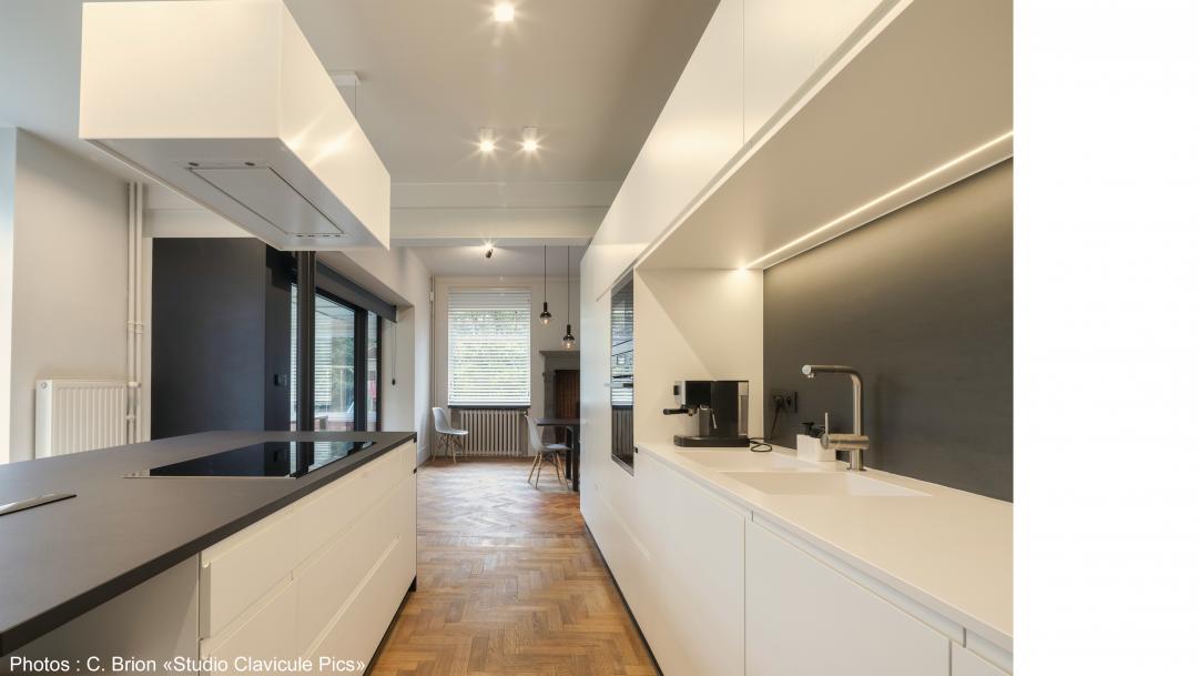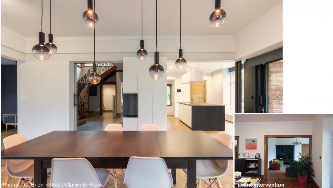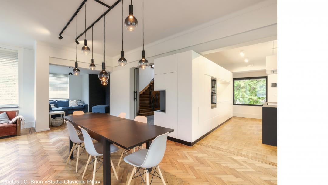 Le projet consiste en la transformation du rez-de-chaussée d'une habitation bourgeoise.L'intervention crée un espace ouvert fonctionnel, organisé autour d'un mobilier sur mesure animant la cage d'escalier existante et intégrant les mobiliers de cuisine et de nombreux rangements.